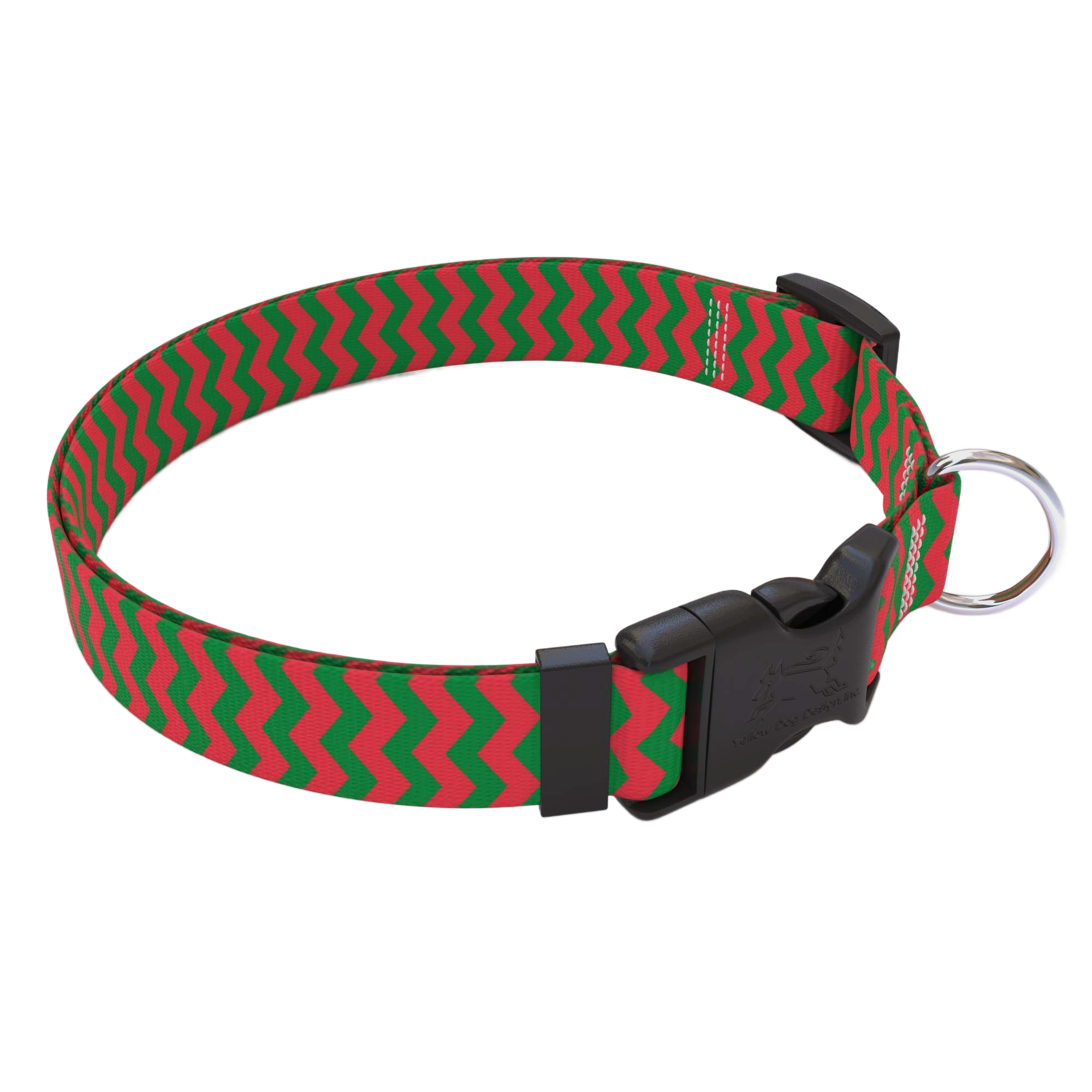 Designed for everyday wear, these collars combine comfort, security and style. Handmade in our plant in Indian Trail, NC with some Global Materials with durable, high-quality polyester that is machine washable. Easy to put on, these collars have plastic buckles with rounded edges for comfort and a nickel-coated D-ring. They come in different sizes with adjustable slides for a custom fit, even for growing puppies. Plus, all sizes come with a separate ring to attach an ID tag. And you can grab a matching leash to complete the look!  Perfect for Christmas!